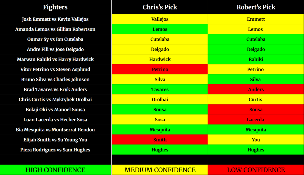 Robertson has reeled off 4 wins in a row while Lemos is on a one fight skid after a loss to the experienced wrestler Tatiana Suarez. Lemos got taken down a couple times in that fight but defended well. She showed good cardio as well, ending the fight with an impressive flurry. She probably finishes Suarez if that fight was a 5 rounder. While Robertson comes in on a win streak her opposition in that time hasn’t been top tier. Everyone she beat was on a losing streak of their own and she did not exactly look elite against any of them. Robertson definitely has not shown the wrestling skills to control Lemos like Suarez did. Robertson definitely won’t be able to wrestle Lemos to death like Raul Rosas did to Rob Font last weekend. Whoever picked Rob Font to win that fight should not be trusted with anything going forward. Chiwiwis long time. Now Robertson might take Lemos down a time or two but Lemos’ grappling has improved so much over her career I think she can handle it. Even if the fight hits the mat Lemos did well grappling against the jiu-jitsu ace Mackenzie Dern when they fought in 2024 and won a decision. That gives me plenty of confidence to pick Lemos here. She will be able to defend Robertson’s grappling well enough to force a stand up fight. I don’t think Robertson stands a chance on the feet against Lemos. One big punch from Lemos will set the tone for this fight. Only question is whether Robertson will survive until the end.