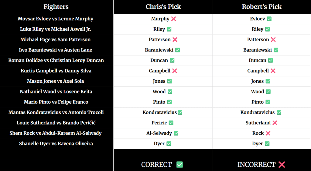 I am victorious! Was it a pretty victory? No. Was it a robbery on the scorecards? Potentially. But a dub is a dub! Hats off to my brother, Chris. He once again had high-quality picks overall and scored 10/13 picks correctly! Whereas I scored 9/13 picks correctly. Chris was so close to the land of victory, which he was especially confident in after picking the first 7 fights right. But the main event? My man Evloev got the W in a very close contest, which is exactly what I needed to go up 2-1 in our Brother’s Battle Breakdowns!