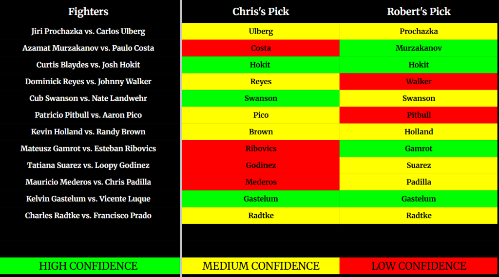 Prochazka is a wildman in the cage and he is an unpredictable force as a result. On the flip side, Ulberg is a crisp and precise striker who will look to counter the pressure of Jiri. In all honesty, I could not be more torn over this fight. My initial instinct is that Ulberg will be able to counter the pressure of Jiri throughout the fight because Ulberg’s counter striking is at an elite level. However, there are so many intangibles that I favor for Jiri as we get closer to the fight. Jiri is about to become a father for the first time, which I believe serves as a massive motivator for him. He also looks to be in the best shape of his life and has endlessly talked about his preparation for this fight. Going into the press conference, I had Ulberg as my pick. But I am flipping to Jiri for the plot! I saw something in Ulberg’s eyes that was too close to fear for my liking. Jiri inside the distance!