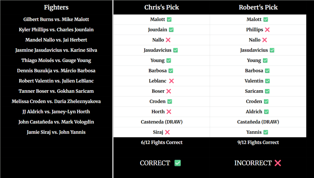 The main event went exactly as I expected. As much as I love Gilbert Burns he just doesn’t have it anymore. Burns has had such a legendary career with so many epic fights. His war against Khamzat Chimaev is an all-time great fight. He definitely belongs in the Hall of Fame. But for now he made the right decision to retire. Mike Malott was patient for 2 plus rounds and waited for the right opportunity to strike. It seemed like whenever Malott threw strikes they landed. Burns’ face was already busted up going into the third round. One more sharp combination from Malott in round three and the fight was over. Again I was sad to see Burns go out like that but with that finish my ultimate pick of the week hit as this fight and the opening fight both ended before decision. I hope retirement treats Gilbert Burns well.