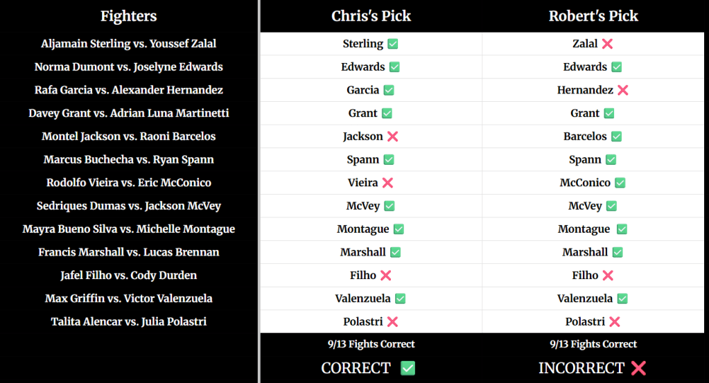 Were there misses? Of course. This card had chaos all over it. Garcia got it done over Hernandez, and I’ll tip my cap there. Sterling did what Sterling does in the main event – heavy grappling, control time, veteran composure. Clean performance. I was very close to going 11/13 but I pick flipped to Polastri and Zelal last minute. Massive mistake on my part and I should have trusted my gut.